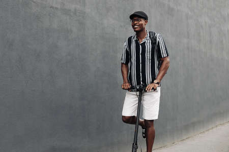 African american man with scooter on black brick wall background, guy with backpack, young student with electric scooter