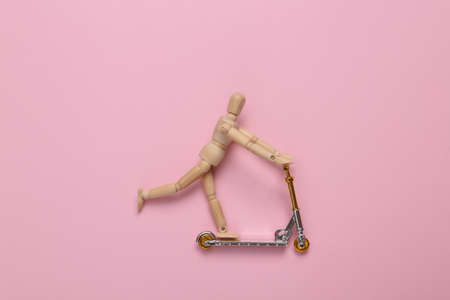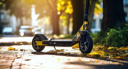 bright yellow electric scooter on small wheels for people to ride. lease of ground pedestrian transport. ease of movement. green accessible environment in the city, caring for the environment.