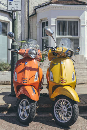 London/UK-1/08/18: Colorful Vespa scooters, that have been known for their painted pressed steel unibody which combines a complete cowling for the engine, flat floorboard, and prominent front fairing