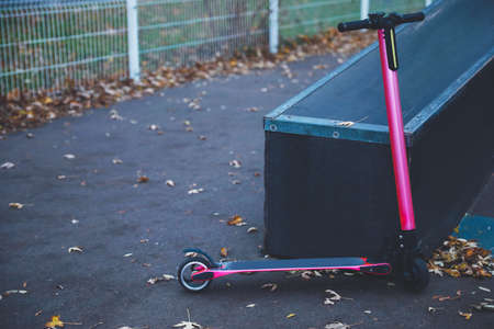 Kick scooter closeup standing against shabby walls and mesh fence with sunset and white houses in background
