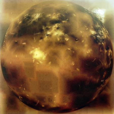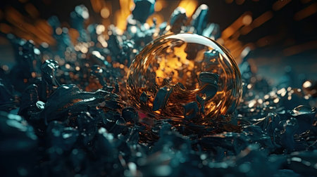 A dark sphere radiates golden light, surrounded by flowing textures that create a dynamic composition.