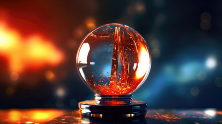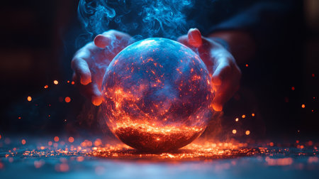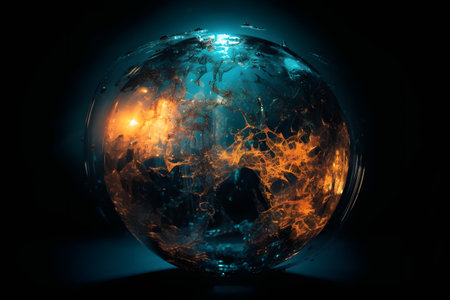 A holographic Fire globe with glowing particles on a dark background, made up of many particles. Generative AI.
