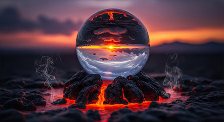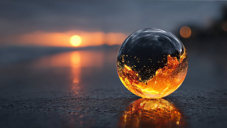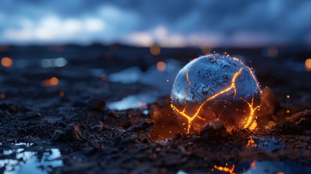 A glowing Earth-like sphere rests on the ground, illuminated by a vibrant sunset, surrounded by textured terrain.