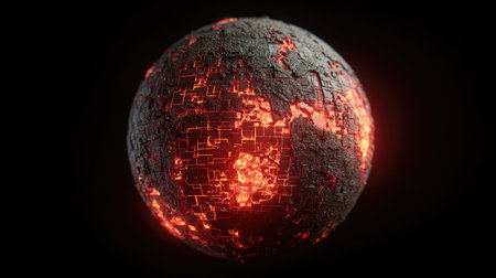 Fiery planet consisting of lava, with a cracking surface, a view from space. Generative AI.