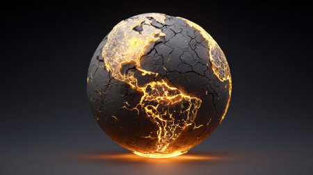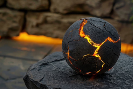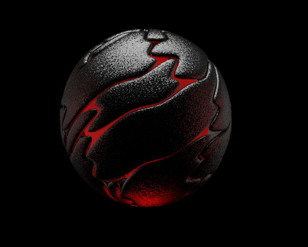 3D dark sphere with glowing orange texture on a dark background. 3d render illustration