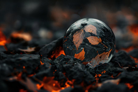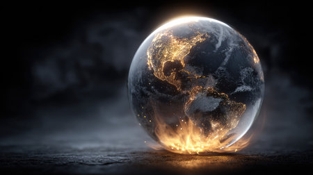 Glass planet earth on fire on black background, copy space, concept of global warming or world war.