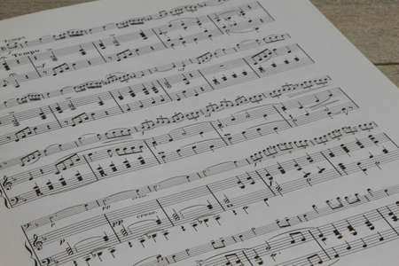 Old music book with notes on the wooden table in vintage style.
