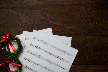 Top view Christmas music note paper with Christmas wreath on wooden background and copy space.