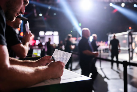 Male hand signing a contract while standing in front of the stage lights