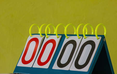 a picture of a badminton scoreboard. on a yellow background.