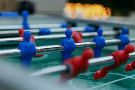 Table football game with red and blue players, close up. Space for text
