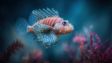 A vibrant lionfish showcases intricate patterns and textures, highlighted against a deep blue background. The underwater scene features colorful coral and plants, creating a captivating visual experience. Suitable for educational materials, marine life publications, and various creative projects.
