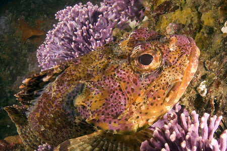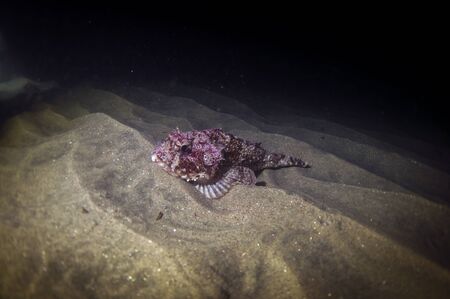 A poisonous California scorpion fish resting on the ocean floor.