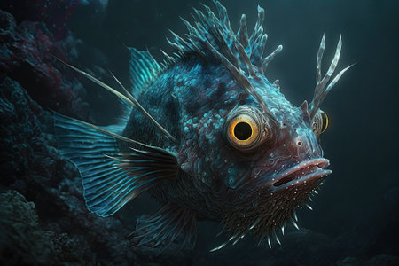 Scorpionfish up close, with its intricate details, vibrant colors and unique features. Fascinating and venomous marine creature. Generative AI
