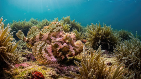 An underwater scene displays a camouflaged fish among aquatic plants. The composition showcases a medium shot with a clear, blue-green water environment. The image features natural sunlight, highlighting the textures and details of the plants and the fish. It is suitable for diverse commercial and editorial purposes.