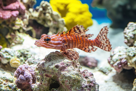 This image was generated with AI. A breathtaking lionfish (Pterois) swims gracefully in a well-lit aquarium, showcasing its delicate, fan-like fins and bold stripes. This exotic marine species, known for its venomous spines, is a fascinating attraction in aquariums worldwide. With its flowing movements and striking patterns, the lionfish symbolizes the beauty and diversity of marine life. This AI-generated image captures the elegance of this species in a controlled environment, highlighting the importance of aquariums in marine conservation. Aquarium month is a celebration of underwater biodiversity, encouraging appreciation and awareness of aquatic species like the lionfish. The serene background, featuring corals and soft lighting, enhances the captivating presence of this extraordinary fish.