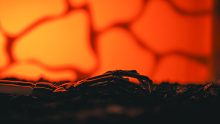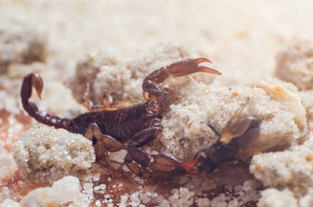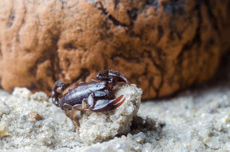 black scorpion ready to strike with its tail sting, covered in mud standing on the ground on a bright morning