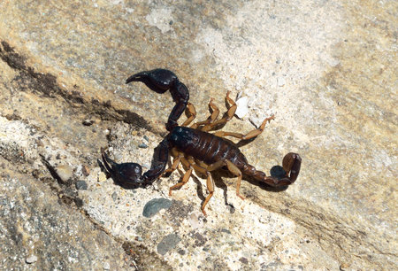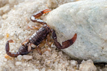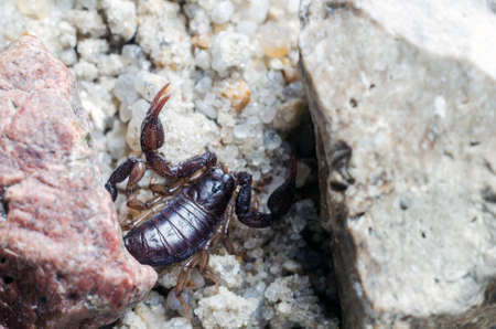A scorpion of the species Buthus occitanus, on a stony substrate.