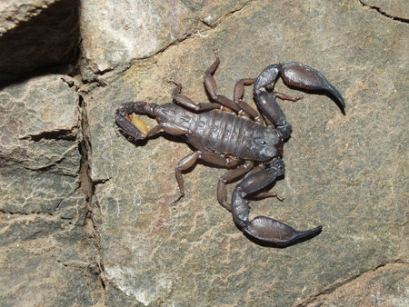 A scorpion in the arid steppe near the Chelik River in Kazakhstan.