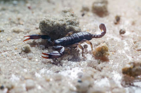 Small scorpion. Wildlife of insects. Macro, selective focus.