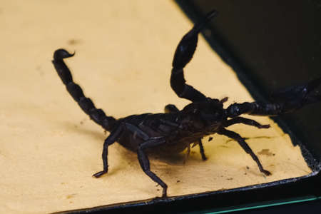 Scorpio in the terrarium. Black scorpion is a poisonous arthropod.