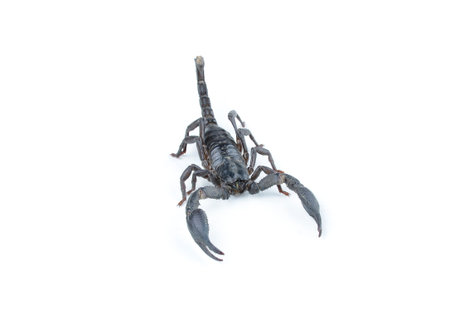 A scorpion on white background shows its powerful stinger threatening to inject its venom. Outdoors.