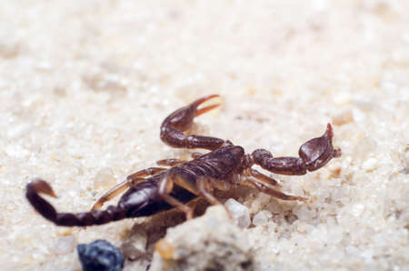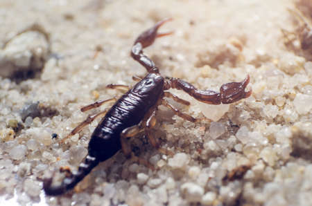 Scorpion creeps on the sand close up.