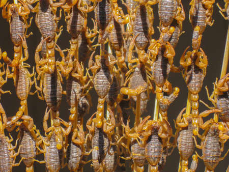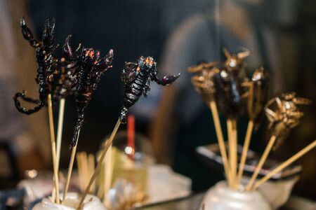 Roasted and fried scorpions on skewers for sale on a street market in China