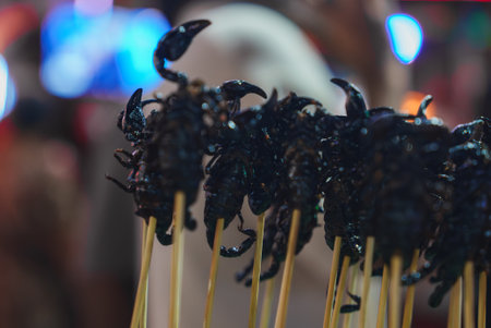 Skewered Scorpions Displayed in a Vibrant Thai Street Market