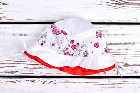Baby-girl white printed summer hat. Infant girl cute flower print panama on old wooden background. Kids summer accessory.