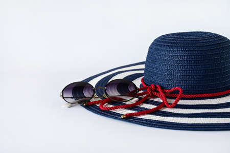 summer hat with a large brim and sunglasses on a white background. Products for summer holidays. Travel concept. Space for the text