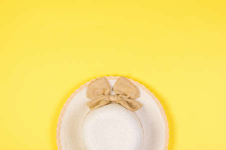 Top view of a wide sun hat on a yellow background. Concept of recreation on the sea coast.
