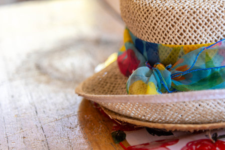 Beach hat on a wooden table.