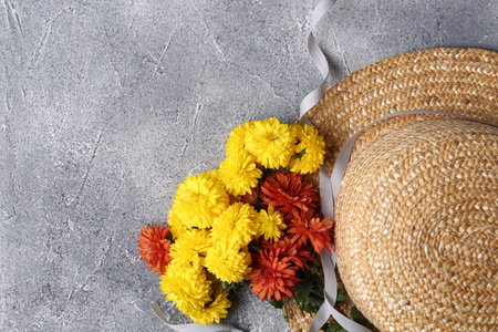 Flat lay composition with bright chrysanthemum flowers and wicker hat on gray textured table. Space for text