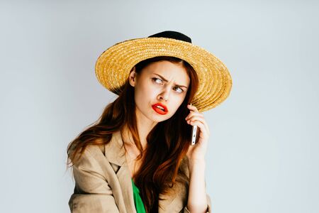 evil red-haired girl in a hat talking on the phone and looking away