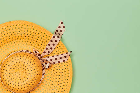 Top view of yellow striped retro hat close-up. Summer concept
