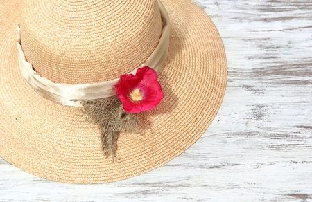 Summer straw hat with hibiscus flowers on old wooden background