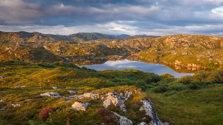 Scottish Highlands with small lakes and rocky mountains full of biting midges, lit by late sunset