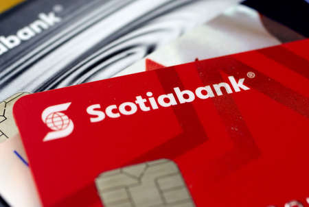MONTREAL, CANADA - SEPTEMBER 21, 2018: Scotiabank Credit Cards, close-up picture. The Bank of Nova Scotia is a Canadian multinational bank.