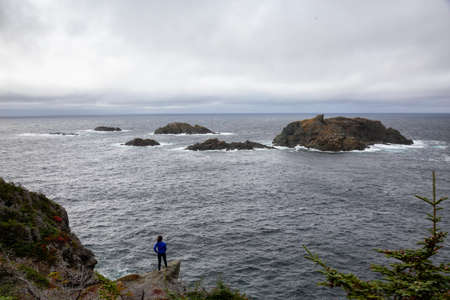 Woman in red jacket is standing at the edge of a cliff enjoying the beautiful ocean scenery. Taken in Crow Head, North Twillingate Island, Newfoundland and Labrador, Canada.