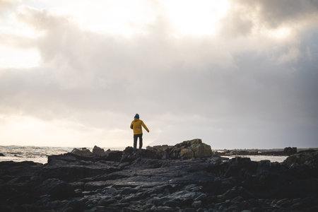 Young traveler walks along a rocky beach during a breathtaking stormy sunset in western Iceland, enjoying the last rays of sunlight. Dramatic sky and soft Arctic light.