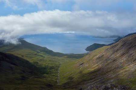 Clouds over a sea bay surrounded by mountains. Camasunary, Isle of Skye, Scotland