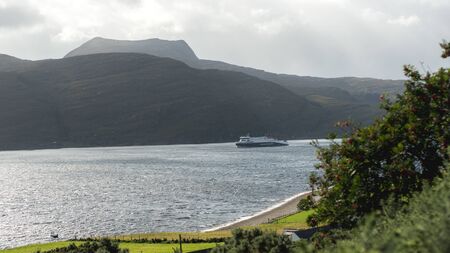 arriving ferry in bay at summer, ullapool scotland