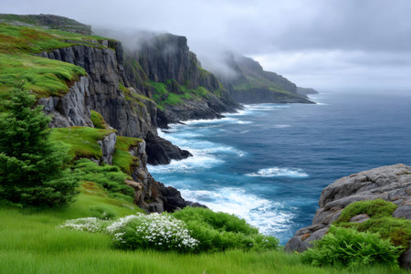 This image showcases a rugged coastline with dramatic cliffs and rocks, set against an overcast sky, perfect for showcasing the beauty of nature and outdoor landscapes.