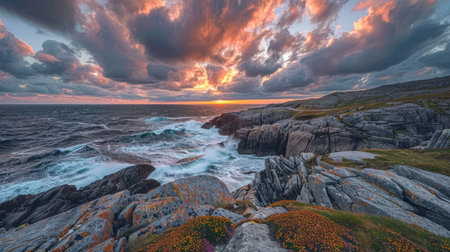 AI Generated. Dramatic Sunset over Rocky Coastal Landscape
