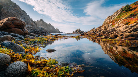 Discover a stunning coastal landscape featuring a rocky shoreline, vibrant seaweed in a tide pool, and clear reflections under a peaceful blue sky.