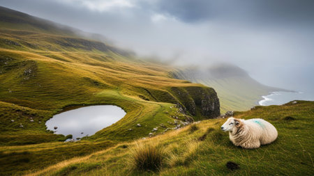 A sheep rests peacefully on a grassy hillside overlooking a body of water in this outdoor scene. The landscape features rolling hills, a small pond, and a cloudy sky, suggesting a natural and serene environment. The composition employs a wide angle shot with soft lighting.