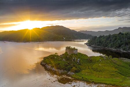 Aerial drone shot of Castle Tioram, it is a ruined castle that sits on the tidal island Eilean Tioram in Loch Moidart, Lochaber, Highland, Scotland. It is located west of Acharacle.