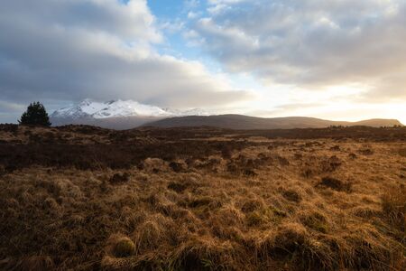 Scottish landscape in the north of Scotland, United Kingdom. The mountain range is known as the Isle of Skye.