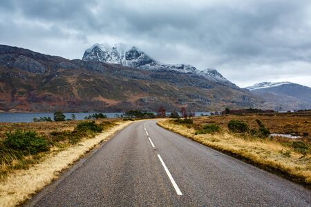 A road in a beautiful landscape beneath a snowy mountain in Highlands, Scotland